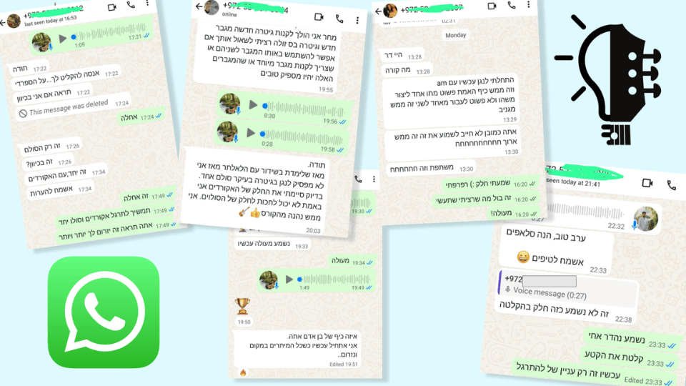 כל חברי גיטריסט על יכולים לתקשר עם אסף בווטסאפ באופן אישי. מתי שאתם צריכים לשאול שאלות, להתייעץ, ולשלוח סרטונים של הנגינה שלכם לפידבק אישי - תרגישו חופשי. ברגע שאתם מצטרפים, אסף איתכם לאורך כל הדרך.